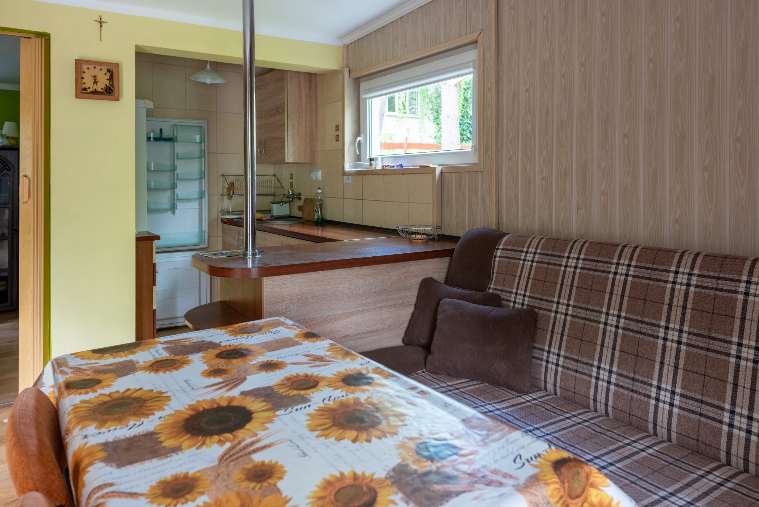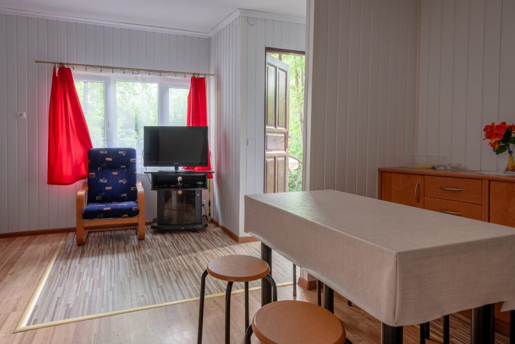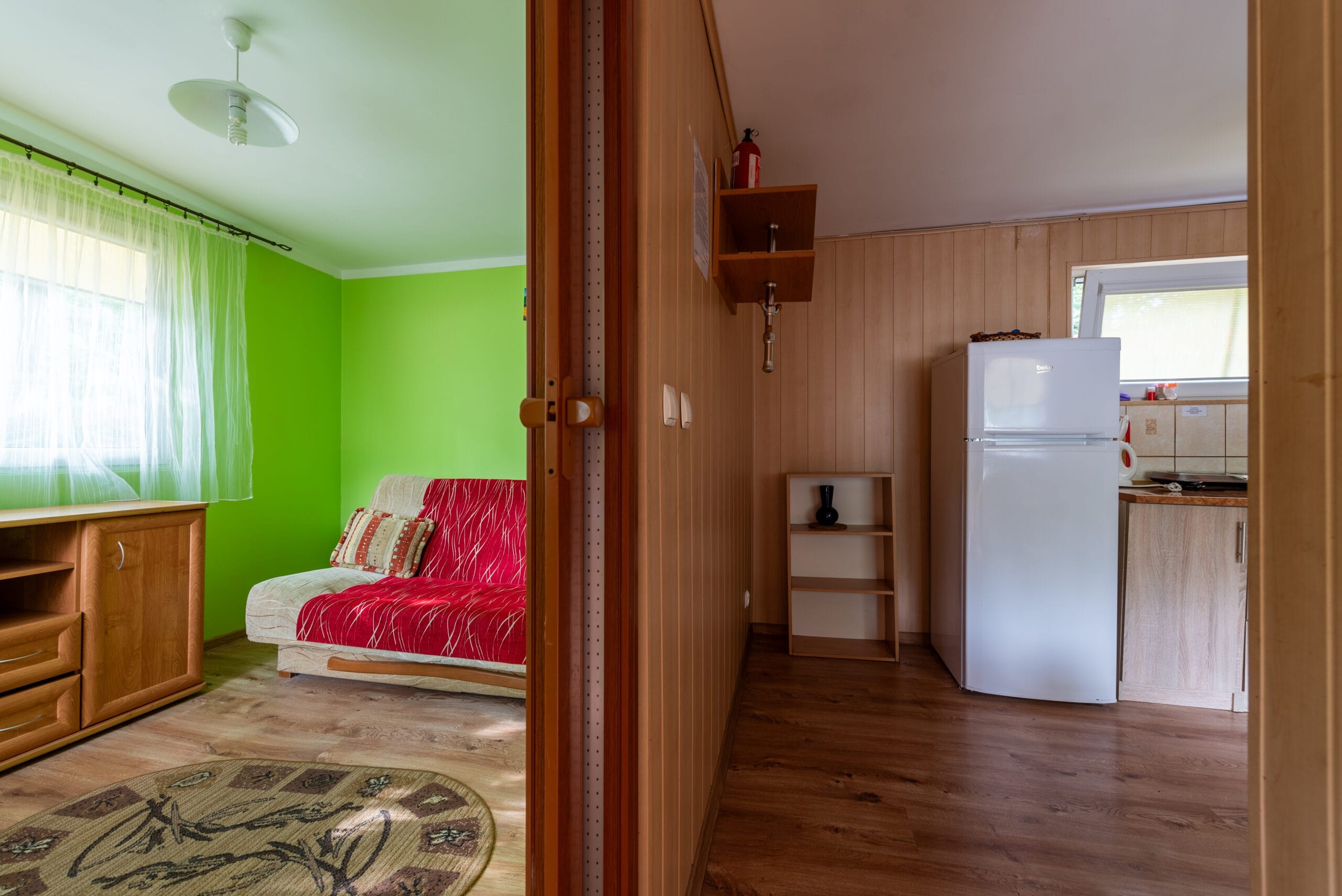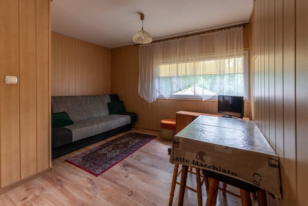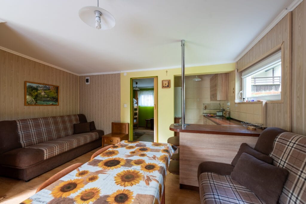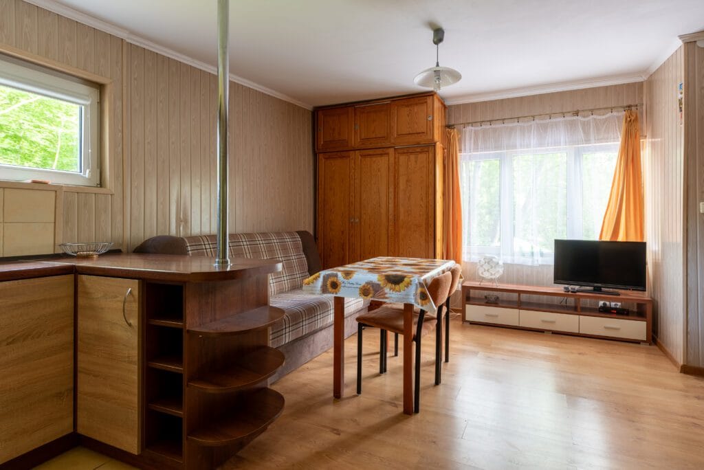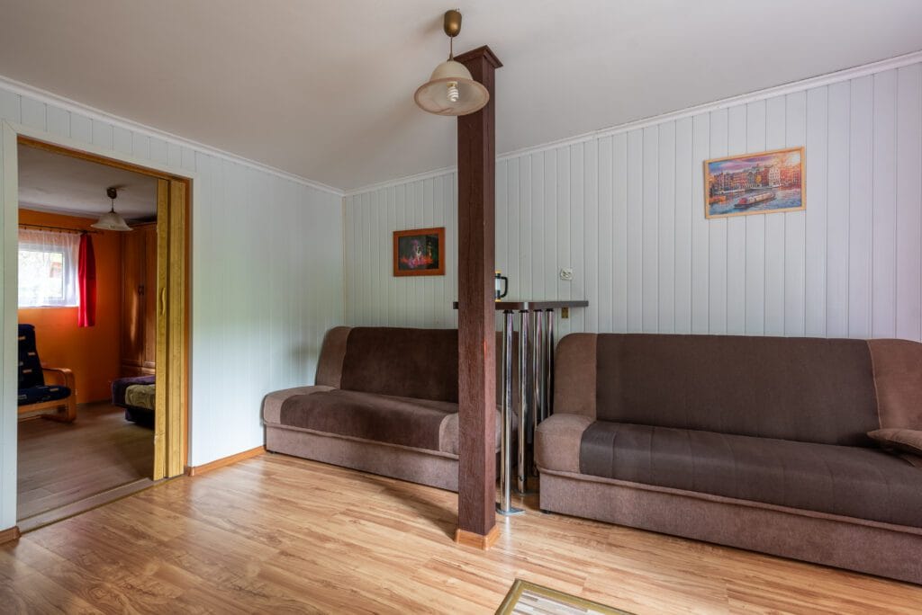 Domek składa się z 2-óch pokoi, kuchni i łazienki. Pierwszy pokój w formie „salonu” jest wyposażony w dwie wersalki, stół oraz komody. Między wersalkami jest blat, przy którym można odpocząć przy kawie. W tym pokoju jest również telewizor. Do drugiego pokoju wchodzimy z „salonu”. Jest to pokój przejściowy, ponieważ z niego jest wejście do łazienki. To typowa sypialnia z jedną wersalką i szafą, oraz małą komodą. Kuchnia wyposażona we wszystkie naczynia, garnki, czajnik elektryczny i oczywiście kuchenkę dwupalnikową. Do dyspozycji lodówka z zamrażalnikiem.