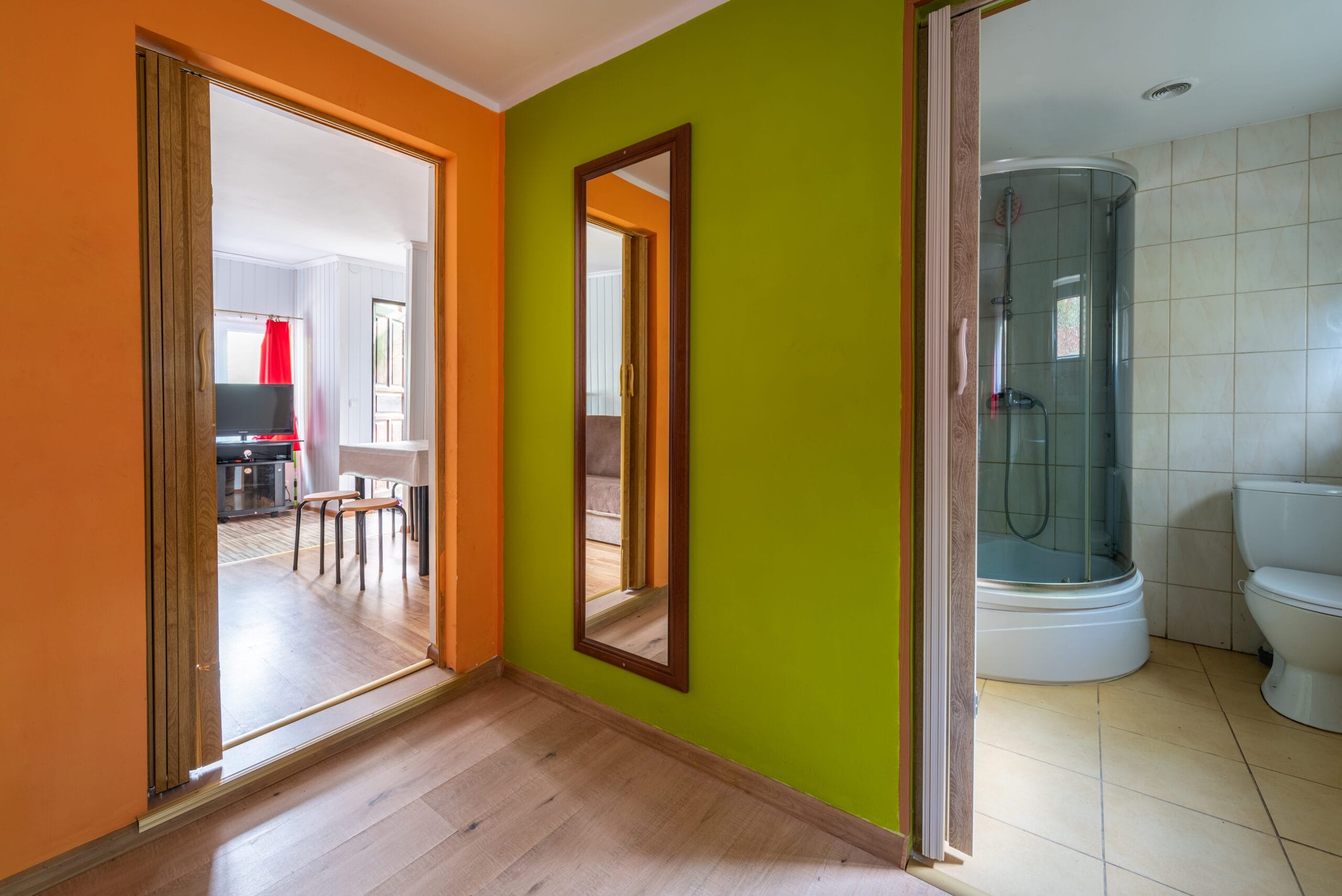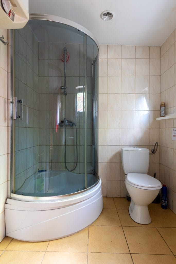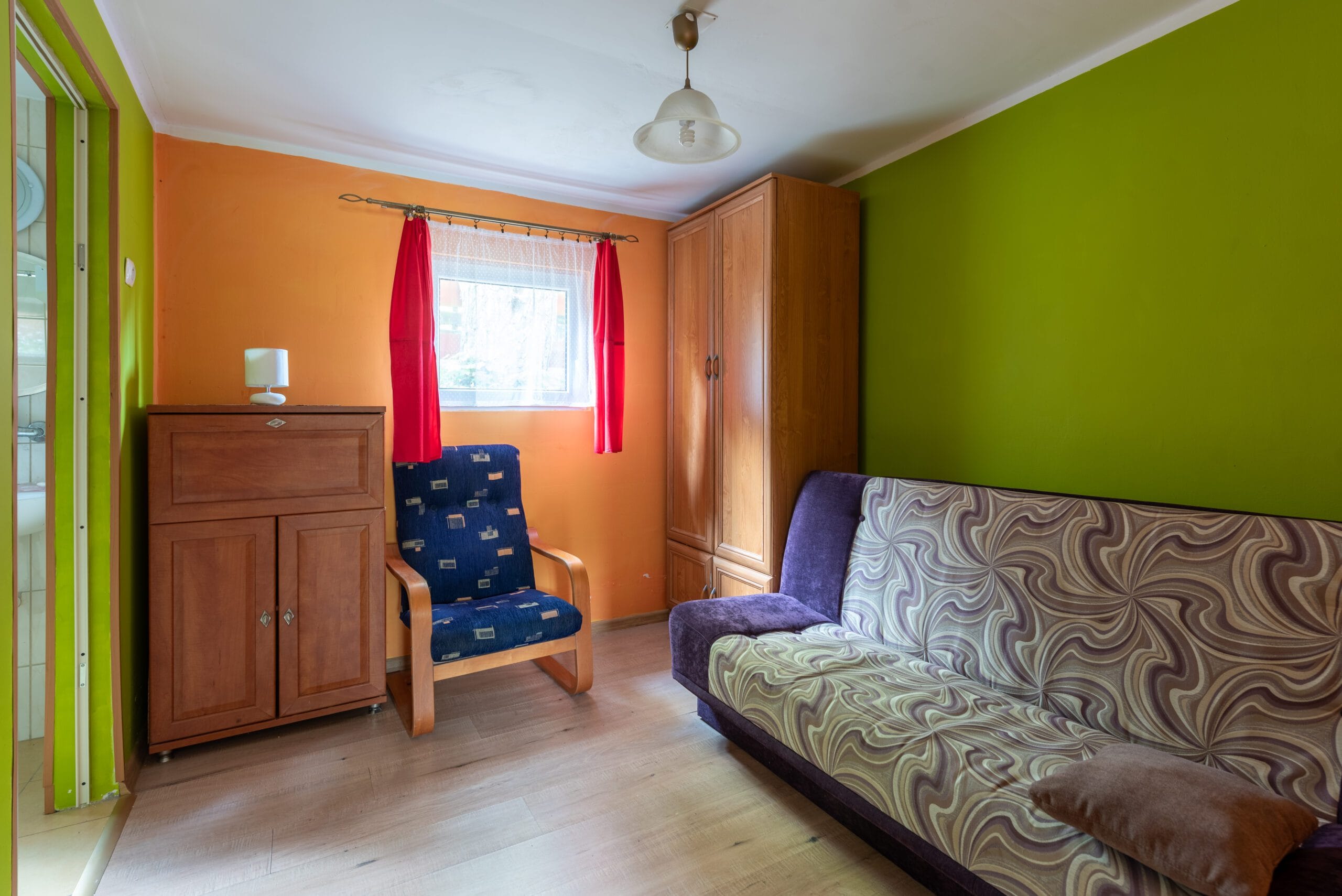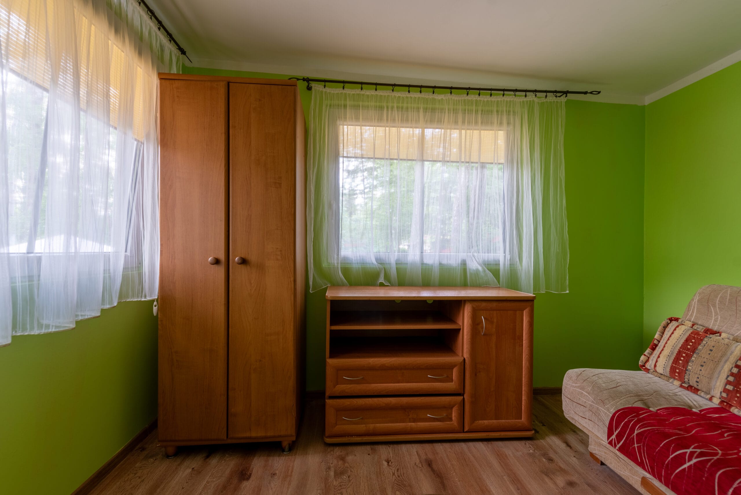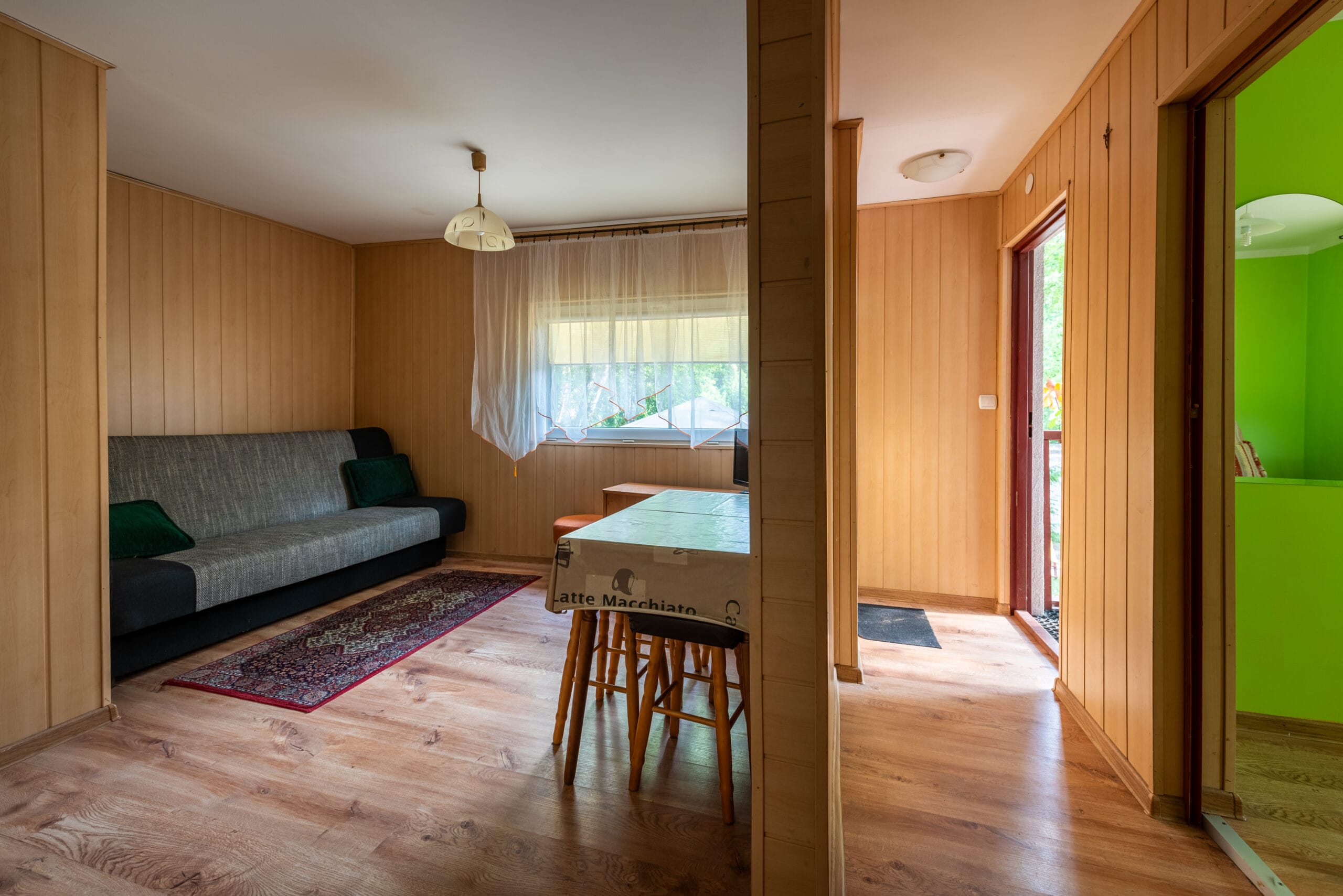 Domek składa się z 2-óch pokoi, kuchni i łazienki. Pierwszy pokój w formie „salonu” jest wyposażony w dwie wersalki, stół oraz komody. Między wersalkami jest blat, przy którym można odpocząć przy kawie. W tym pokoju jest również telewizor. Do drugiego pokoju wchodzimy z „salonu”. Jest to pokój przejściowy, ponieważ z niego jest wejście do łazienki. To typowa sypialnia z jedną wersalką i szafą, oraz małą komodą. Kuchnia wyposażona we wszystkie naczynia, garnki, czajnik elektryczny i oczywiście kuchenkę dwupalnikową. Do dyspozycji lodówka z zamrażalnikiem.